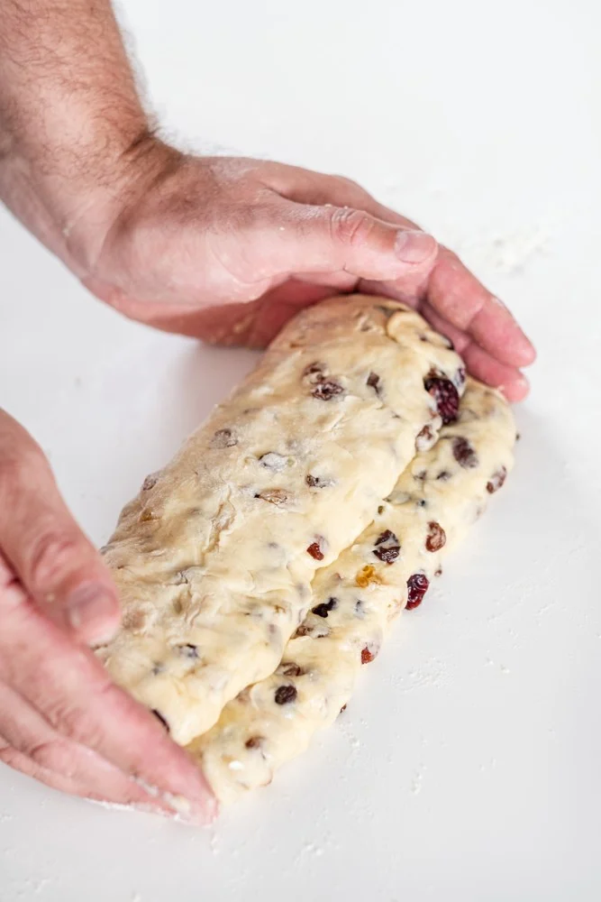 6. Štolu pomoučenýma rukama přemístěte na plech s pečicím papírem, spojem nahoru.