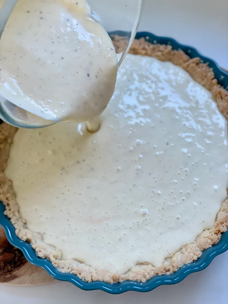 6. Hladkou tekutou náplň bez kousků nalejte na předem upečený základ, teplotu stáhněte na 150 °C a pečte dalších 25 až 30 minut do zatuhnutí a zezlátnutí.