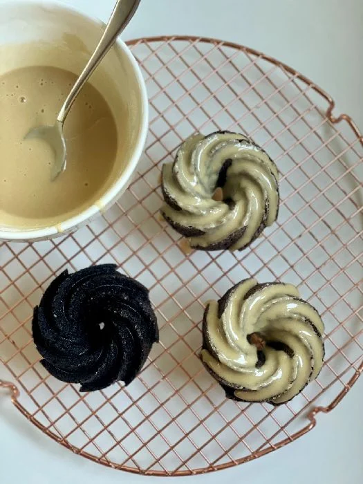 Upečené bábovky nechte krátce  vychladnout a poté vyklopte.  Ještě vlažné je pomocí lžíce polijte polevou. Polevu nechte jen volně stéct a poté dozdobte sušenými květy.