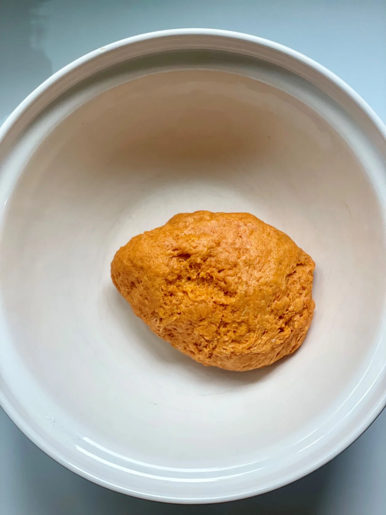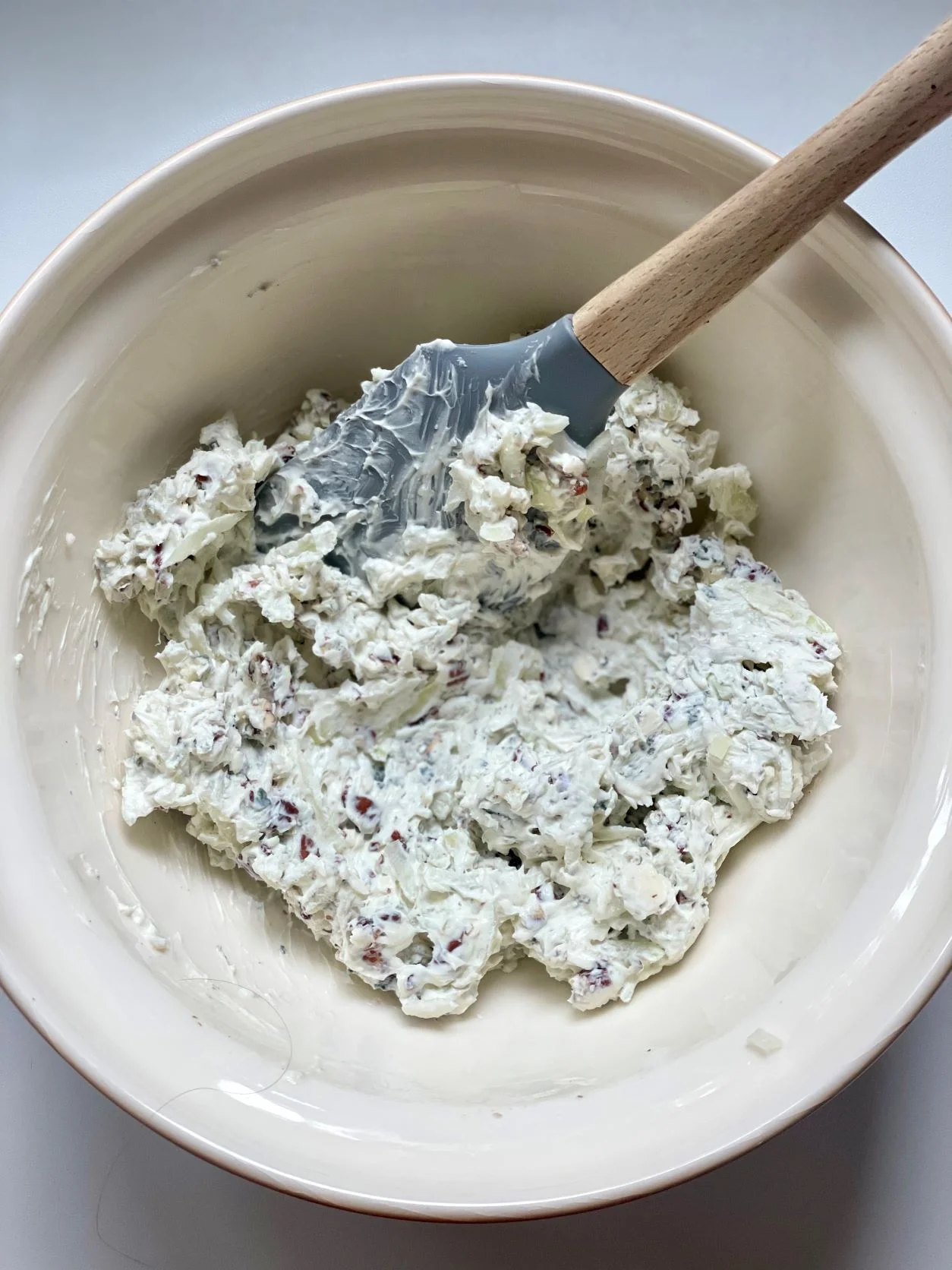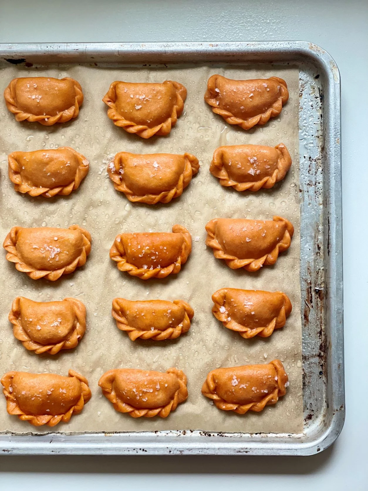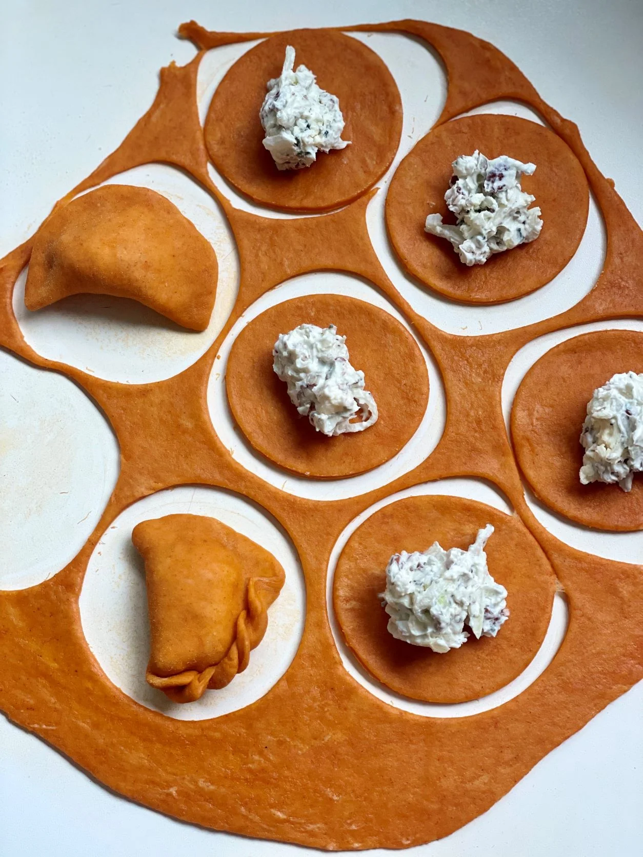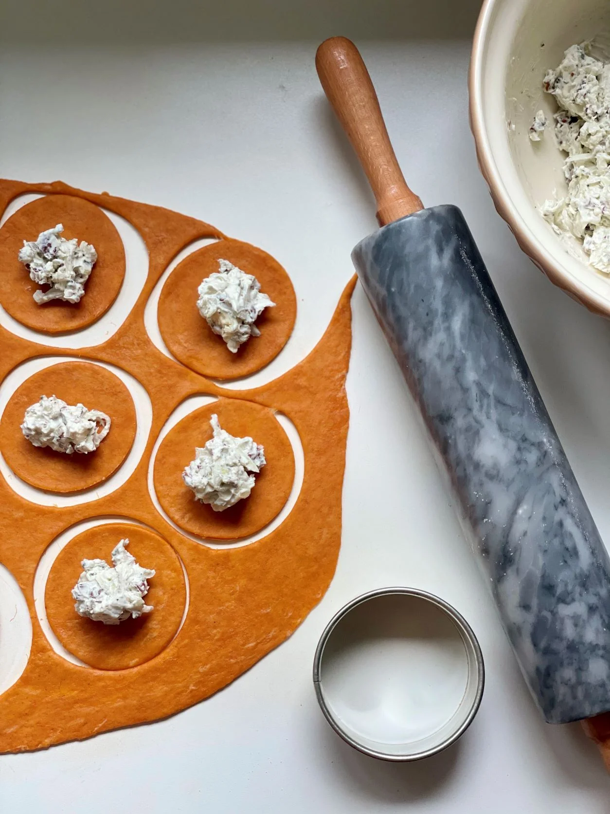 - Na náplň smíchejte všechny ingredience do hladké pasty a doprostřed každého kolečka pomocí čajové lžičky dejte větší porci náplně tak, aby se vám připravované taštičky podařily správně uzavřít a náplň během pečení nevytékala.