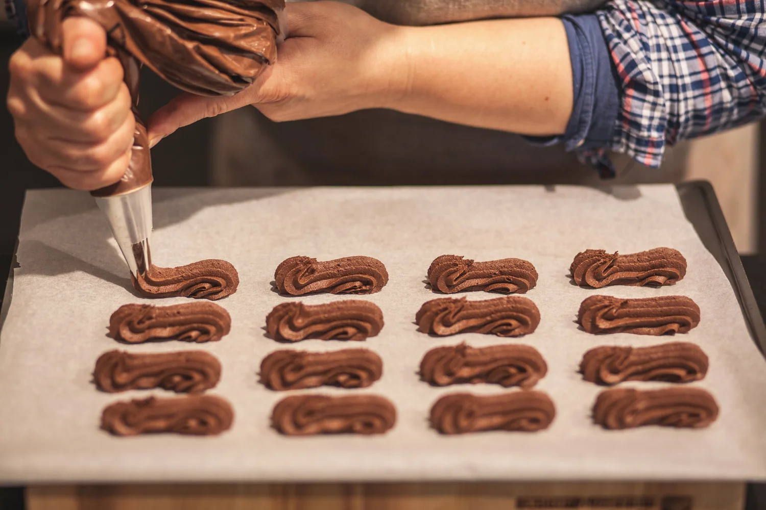 4. Pomocí cukrářského sáčku nastříkejte těsto na plech. S těstem musíte pracovat velmi rychle, aby se nezapařilo.