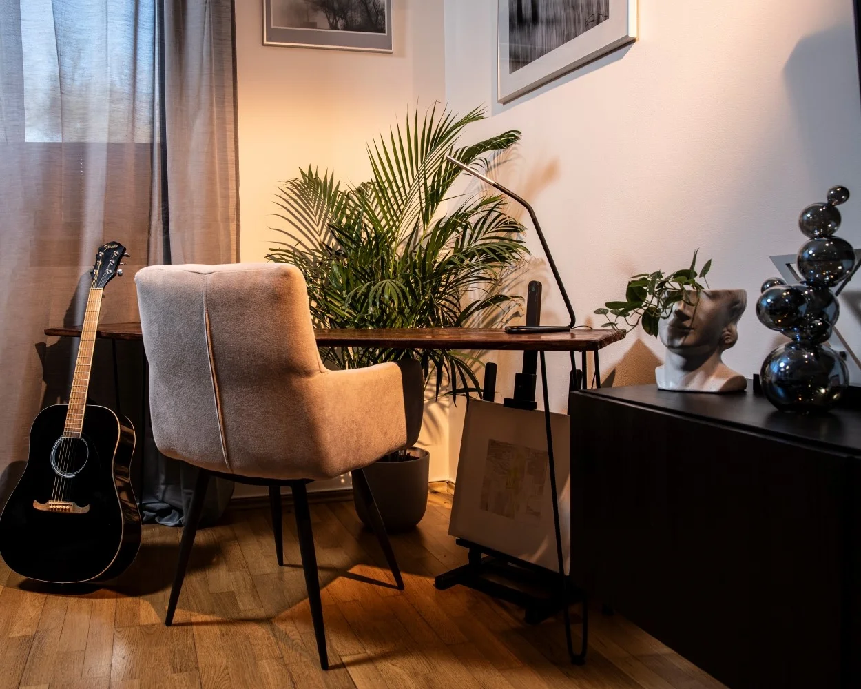 Máme rádi kvalitní zvuk, a proto volba reproduktoru Marshall byla skvělou volbou je umístěný pod televizi tak, abychom jsme na něj mohli napojit i zvuk z televize pro sledovaní filmů, a nejen poslechu hudby.