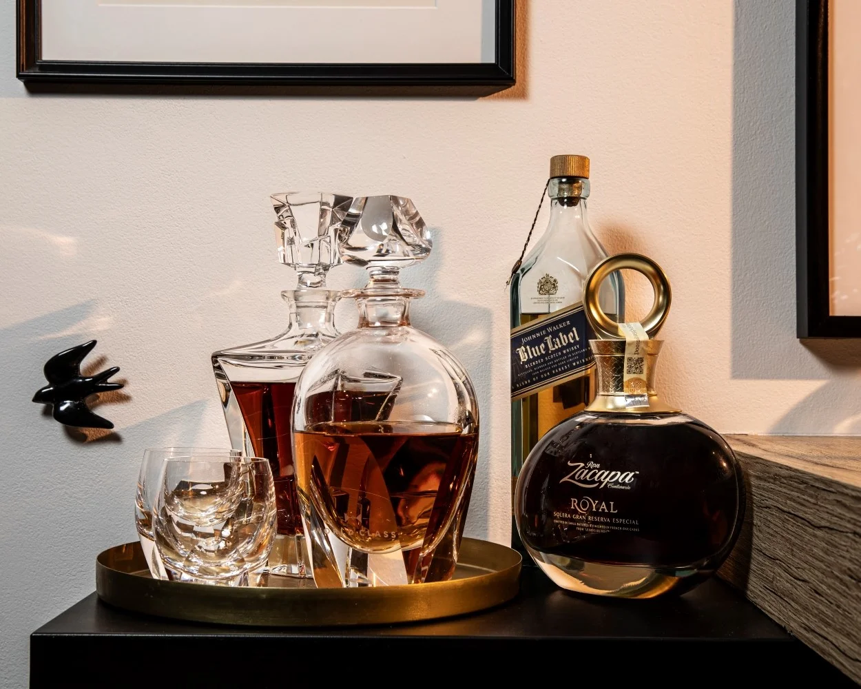 Luxury koutek kde jsou pálenky pro významné dny, události, oslavy. V karafě od sklárny Moser se nachází symbolická whisky, kterou jsme s mojí přítelkyní pili, když jsme se seznámili.