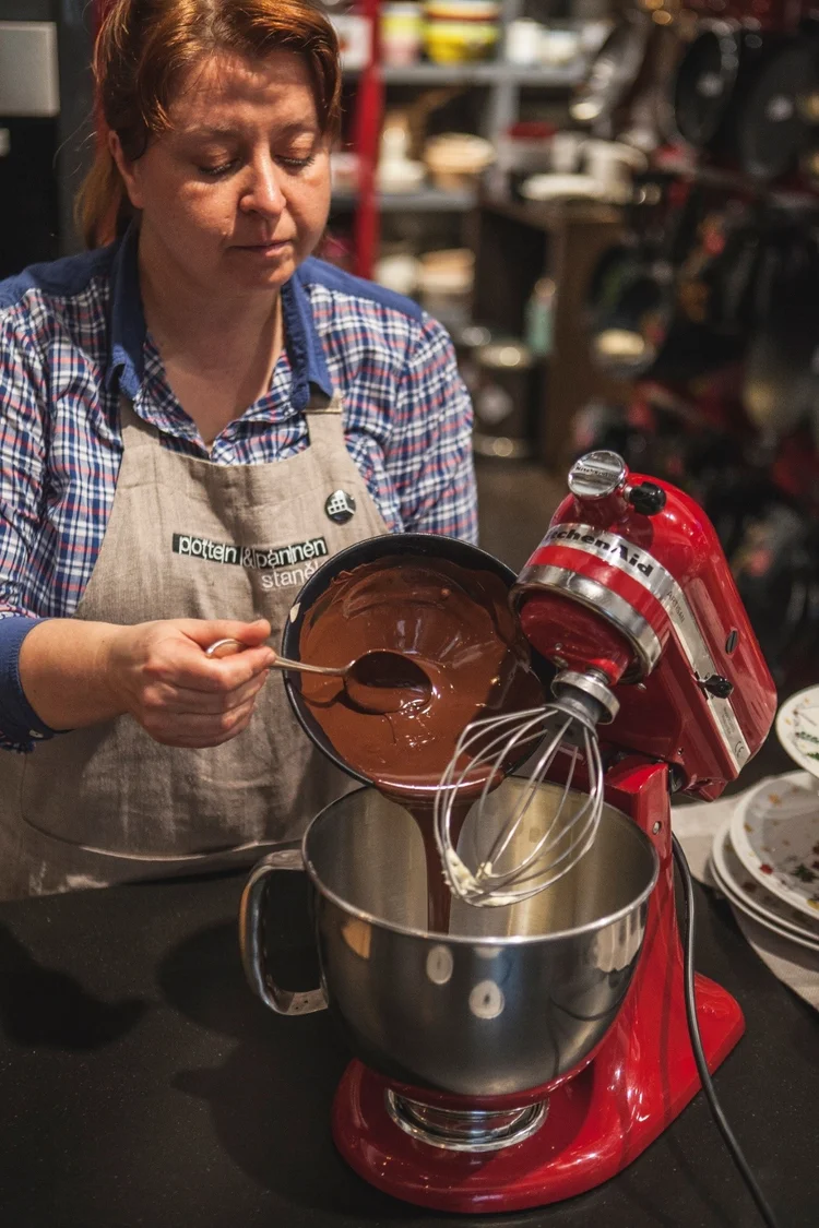 Čokoládu rozpusťte nad vodní lázní a nechejte vychladnout na nižší, než pokojovou teplotu. Lehce povolené máslo vyšlehejte a přidejte k němu rozpuštěnou čokoládu a v robotu promíchejte.