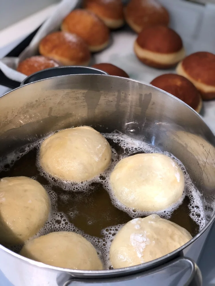 5. Dbejte na to, aby koblihy měly v hrnci dostatek prostoru a aby měly možnost v oleji volně plavat. Kobližky smažte dozlatova, po každé straně 2,5-3 minuty maximálně.