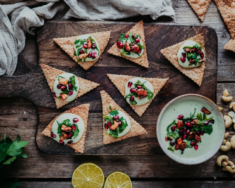 - Na vychladlé trojúhelníčky dejte lžičku šlehané fety, ozdobte bylinkami, granátovým jablkem a ořechy.
