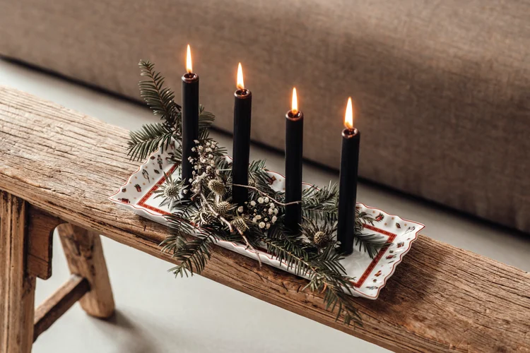 Velké a malé talíře, vánoční etažér, mísy nebo tácy zdaleka nemusí sloužit pouze k servírování pokrmů. Snadno je přetvoříte ve svícen, který doplníte o pár červených jablíček, voňavých šišek, větviček čerstvých jehličnanů, cesmíny nebo břečťanu.