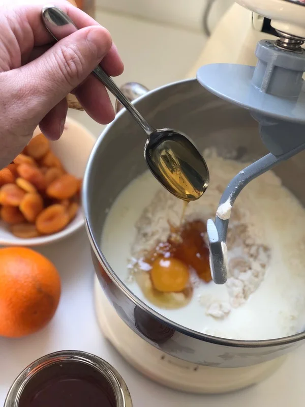 1. Do zadělávací mísy přidejte všechnu mouku, rozdrobené droždí a zalijte vlažným mlékem. Pak přidejte med, cukr, sůl, nastrouhanou pomerančovou kůru, vejce a koření. Vše dobře promíchejte. Nakonec přidejte do těsta kousky změklého másla a hněťte do hladka.