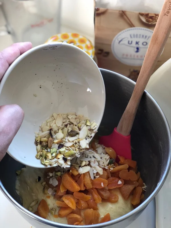 3. Do hotového těsta přijdou úplně nakonec vsypat meruňky a nasekané pistácie.