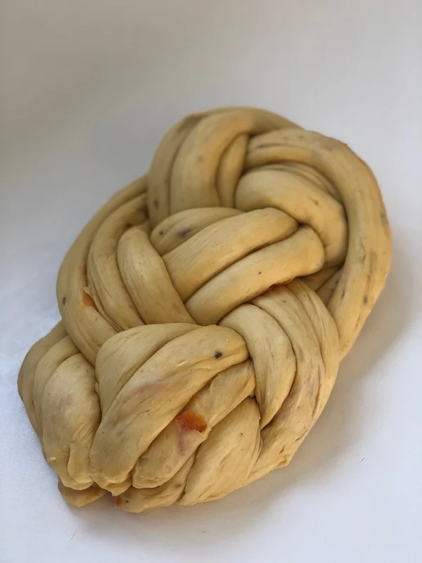 5. Mazanec zapleťte podle návodu níže a pečte v troubě vyhřáté na 160 °C asi 40 minut, do zlatavě hnědé barvy.