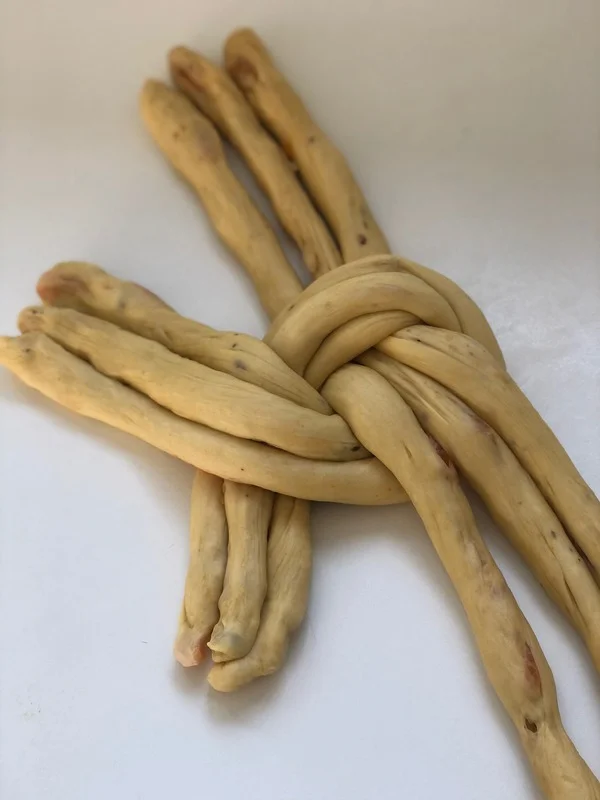 - Vykynulé těsto si rozdělte na 6 stejně velkých dílů a vyválejte v prameny.