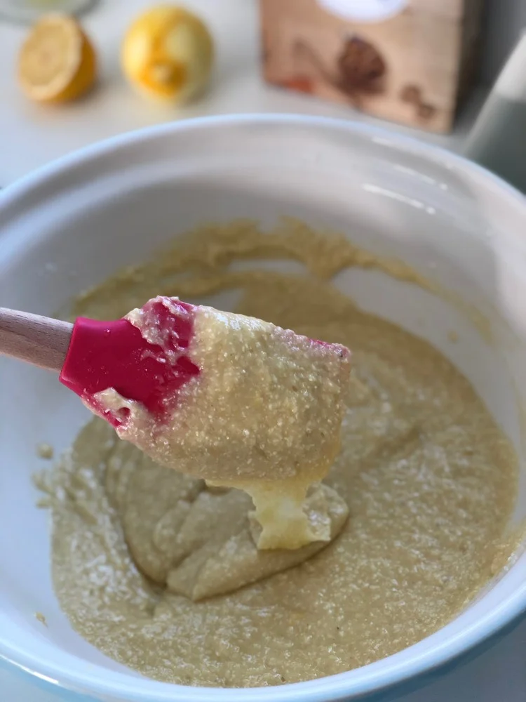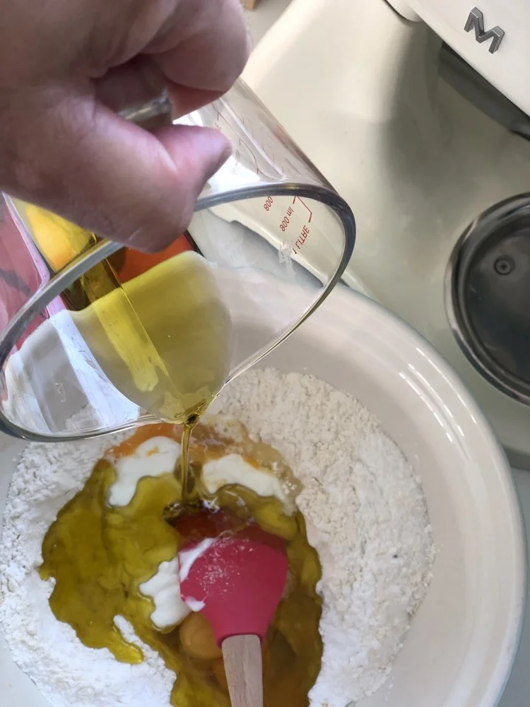 2. Pak přidejte ingredience tekuté – vejce, jogurt, olej a šťávu. 3. Stěrkou vymíchejte dohladka. Pokud máte, můžete použít robot s plochou stěrkou na pomalý stupeň.