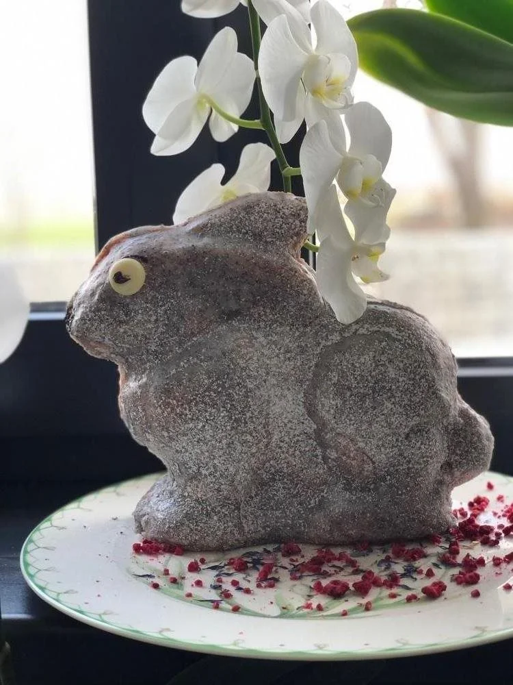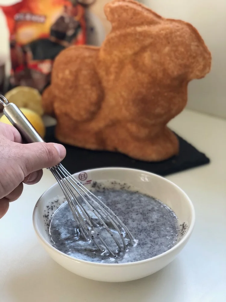 8. Pomocí štětce pak polevou zajíce potřete, nechte lehce zaschnout, nakonec jemně pocukrujte. Dozdobte dle své fantazie.